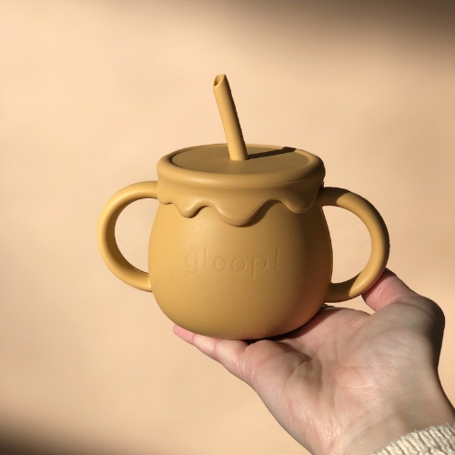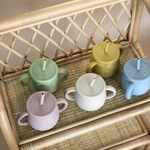 Tampa com palhinha. Caneca em silicone com palhinha e asas para bebés que estão a aprender a beber sozinhos.