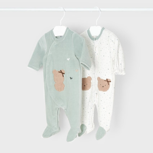 Peça ECOFRIENDS contém algodão sustentável. Original pack de dois pijamas para recém nascido.