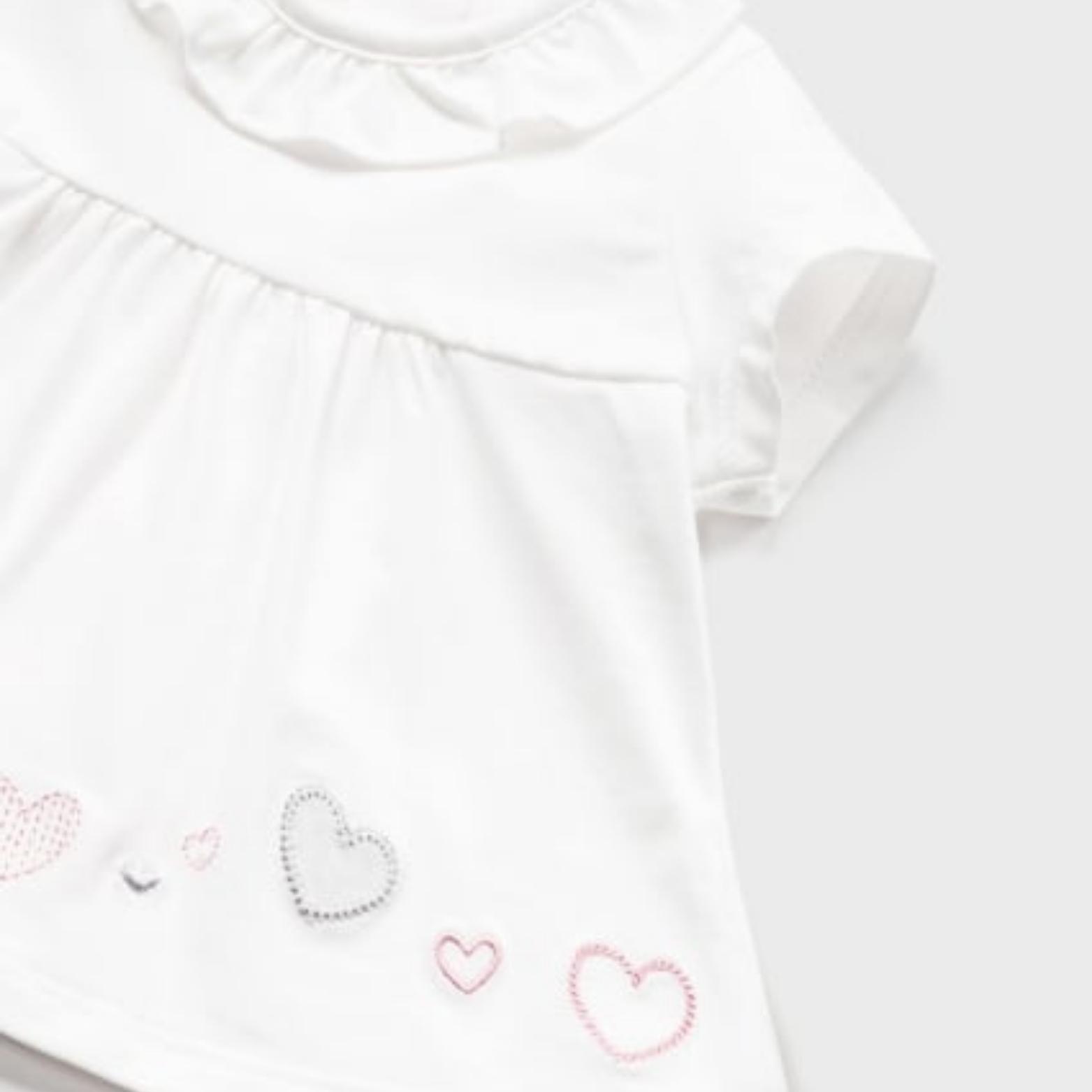 Camisola de manga curta para recém nascido. Gola redonda. Aperta com botões de pressão na parte de trás para facilitar a colocação da peça. Elementos decorativos: folhos decorativos