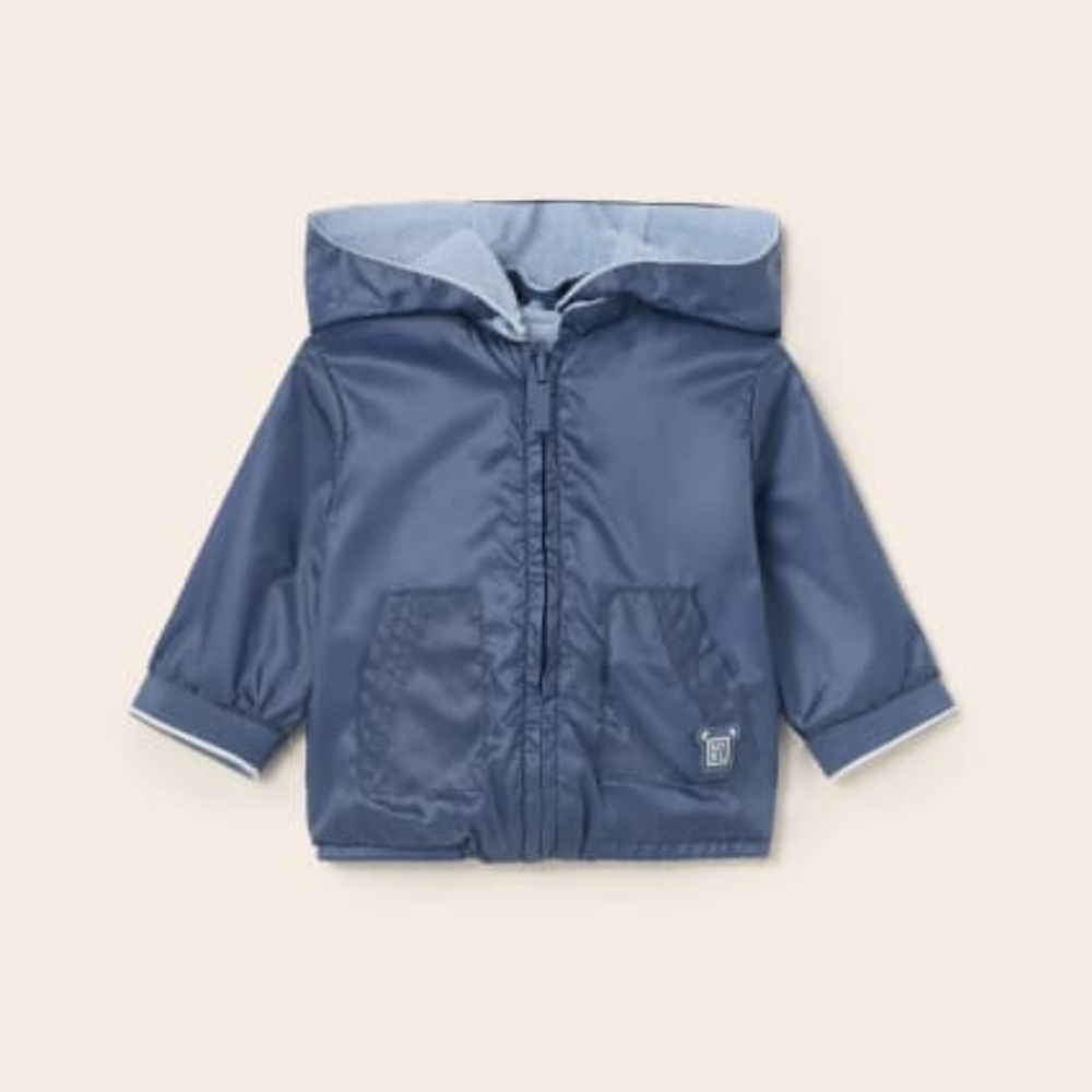 Peça ECOFRIENDS contém poliéster reciclado. Parka de manga comprida para recém nascido. Gola com capuz. Aperta na frente com fecho no centro. Parte de baixo com elástico para um melhor ajuste. Este modelo é do tipo reversível.