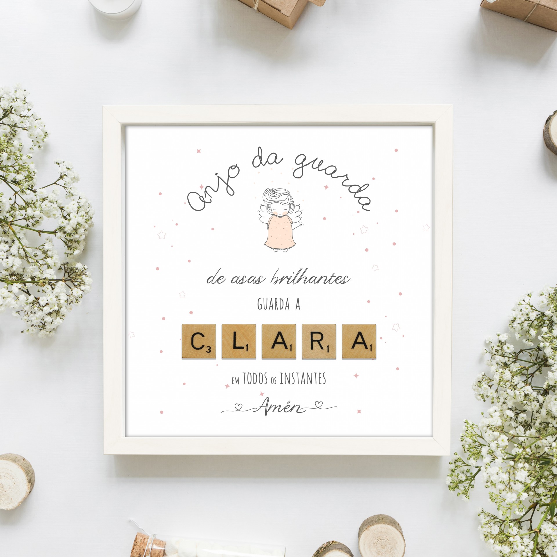 Quadro ilustração personalizado* com nome em letras de madeira + moldura branca.